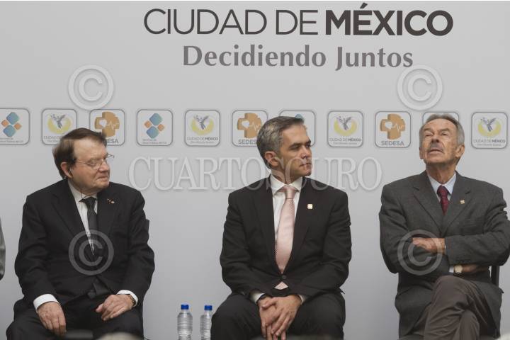 MÉXICO, D.F., 03OCTUBRE2013.- Jean Luc Montagnier, premio nobel de Medicina; Miguel Ángel Mancera, jefe de gobierno del D.F.; y René Druker, sustuvieron un encuentro en la Clínica Especializada Condesa. FOTO: IVÁN STEPHENS /CUARTOSCURO.COM