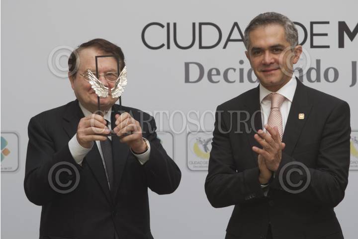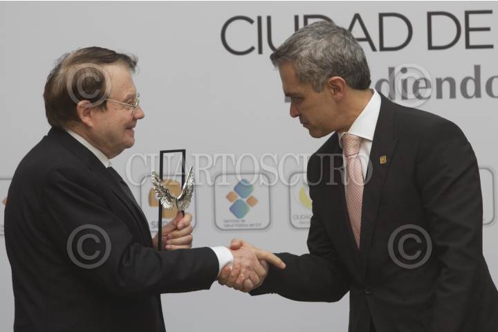 MÉXICO, D.F., 03OCTUBRE2013.- Jean Luc Montagnier, premio nobel de Medicina, fue recibido por Miguel Ángel Mancera, jefe de gobierno del D.F.; y René Druker, en la Clínica Especializada Condesa donde el gobierno local le otorgó la distinción "Alas de la Ciudad". FOTO: IVÁN STEPHENS /CUARTOSCURO.COM