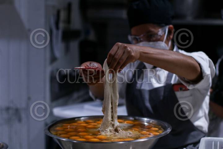 La chef Verónica Carrillo coloca la capara de vainilla a la masa que se horneará para producir las conchas edición especial contra el cáncer de mama.