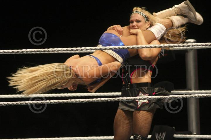 PUEBLA, PUEBLA, 15OCTUBRE2011.- La campeona Beth Phoenix, derrotó a Kelly Kelly, en el encuentro de "divas" del espectáculo de lucha libre estadounidense de la WWE, el cual se presentó en el estadio de béisbol Hermanos Serdán. Cientos de fanáticos pudieron ver a todas las estrellas de la lucha en su categoría RAW. FOTO: FRANCISCO GUASCO/CUARTOSCURO.COM
