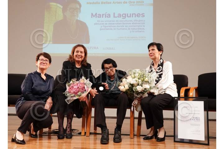 CIUDAD DE MÉXICO, 12AGOSTO2024.- Lucina Jiménez, directora General del INBAL, entregó la Medalla de Oro Bellas Artes en la disciplina de Artes Visuales a la artista plástica María Lagunes, acompañada de sus hijas Silvia y María Segarra Lagunes en la en la Sala Manuel M. Ponce del Palacio de Bellas Artes. FOTO: GRACIELA LÓPEZ /CUARTOSCURO.COM