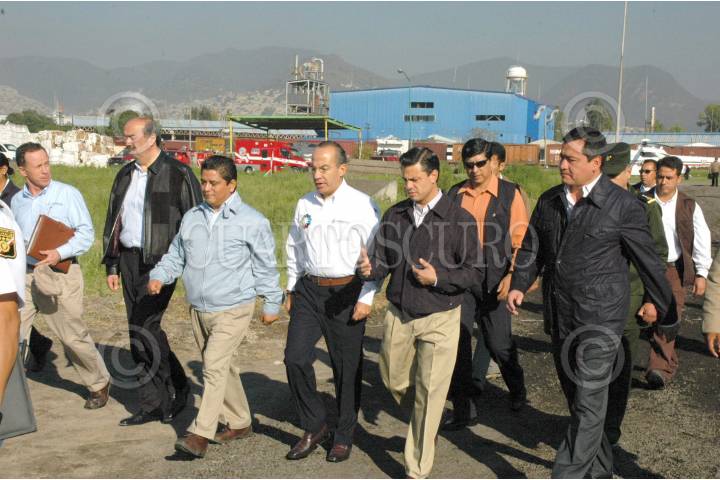 ECATEPEC, ESTADO. DE MÉXICO., 13AGOSTO2008.- El presidente, Felipe Calderón, acudió a este municipio a poner en marcha las obras del Emisor Oriente del drenaje profundo del Valle de México.En la imagen es acompañado por, José Ángel Ávila, secretario de Gobierno del Distrito Federal, José Luis Lueje Tamargo, titular de CONAGUA, José Luis Gutiérrez Cureño,presidente municipal, Enrique Peña Nieto, Gobernador del Estado México y Miguel Ángel Osorio Chong, Gobernador de Hidalgo. FOTO: CUARTOSCUO.COM