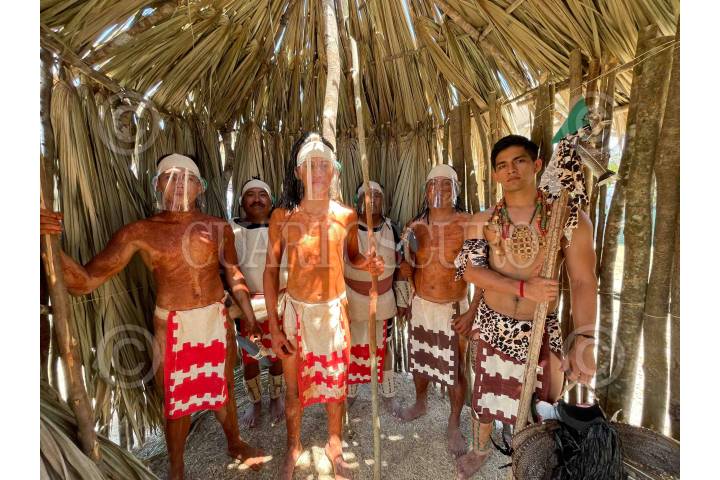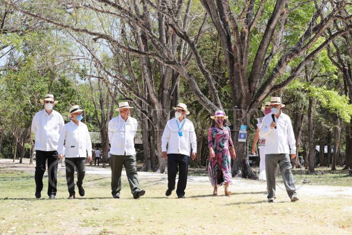 Luis Alberto Arce Catacora, presidente de Bolivia; Marcelo Ebrard, titular de la SRE; Andrés Manuel López Obrador, Presidente de México, Alejandra Frausto, secretaria de Cultura; y Beatriz Gutiérrez Müller, esposa del presidente mexicano, durante el 1517 aniversario de la victoria de Chakán Putum.
