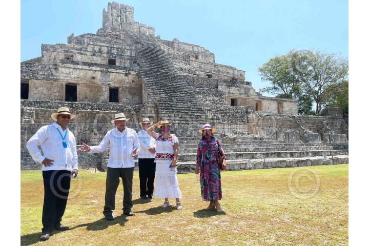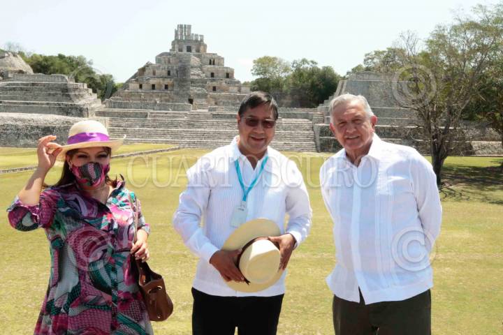 Luis Alberto Arce Catacora, presidente de Bolivia; Lourdes Brigida Durán Romero, esposa del mandatario boliviano, y Andrés Manuel López Obrador, Presidente de México, visitaron la zona arqueológica de Edzná.