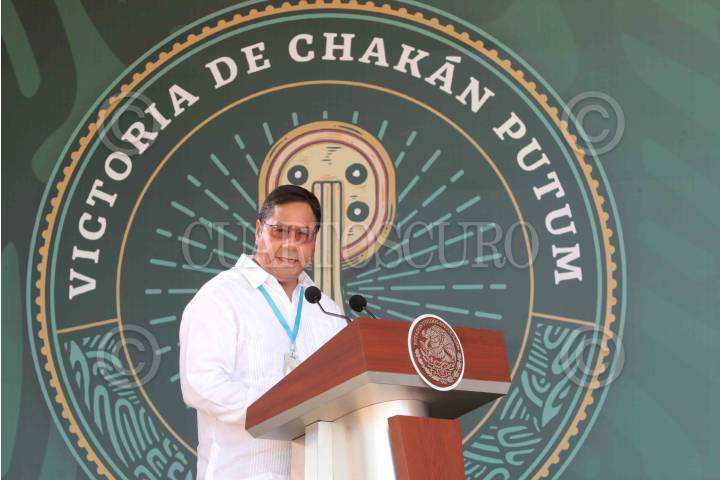Luis Alberto Arce Catacora, presidente de Bolivia; durante la ceremonia del 1517 aniversario de la victoria de Chakán Putum.