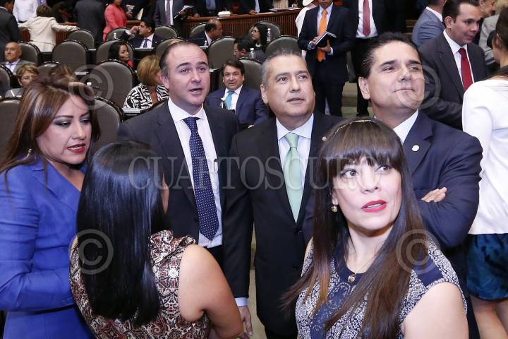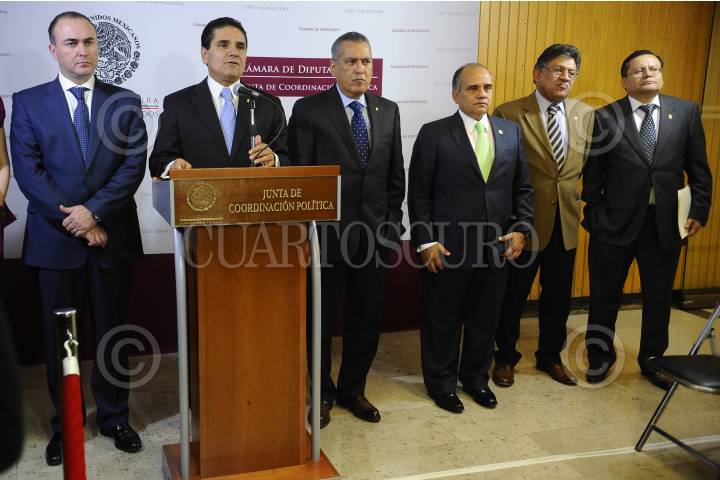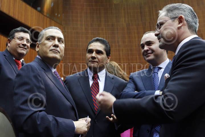 MÉXICO, D.F., 06MARZO2014.- Los diputados Marcelo Torres y José González Morfín, tomaron protestas como vicepresidente y presidente, respectivamente, de la Cámara de Diputados. En la imagen se encuentran con los coordinadores Manlio Fabio Beltrones, PRI, Silvano Aureoles Conejo, PRD y Luis Alberto Villareal, PAN. FOTO: CUARTOSCURO.COM