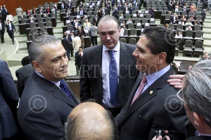 MÉXICO, D.F., 02OCTUBRE2013.- Manlio Fabio Beltrones, coordinador de los diputados del PRI, Manuel Añorve, diputado del PRI y Luis Alberto Villareal, coordinador de los diputados del PAN, coordinador de los diputados del PRD, conversan en la sesión de la Cámara de Diputados. FOTO: CUARTOSCURO.COM