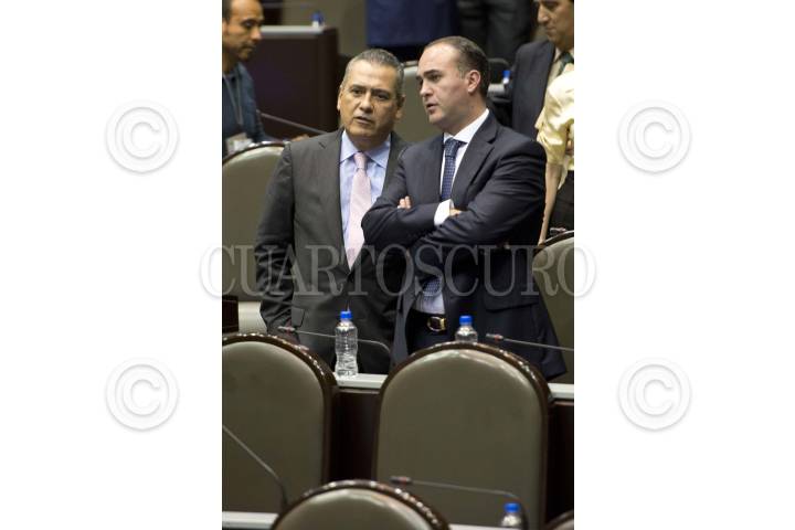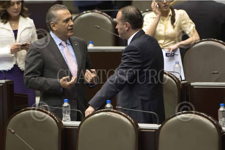 MÉXICO, D.F., 06SEPTIEMBRE2013.- Manlio Fabio Beltrones y Luis Alberto Villarreal, coordinadores de los partidos Revolucionario Institucional (PRI) y Acción Nacional (PAN), respectivamente; dialogan durante la Sesión Ordinaria de la H. Cámara de Diputados. FOTO: MISAEL VALTIERRA / CUARTOSCURO.COM