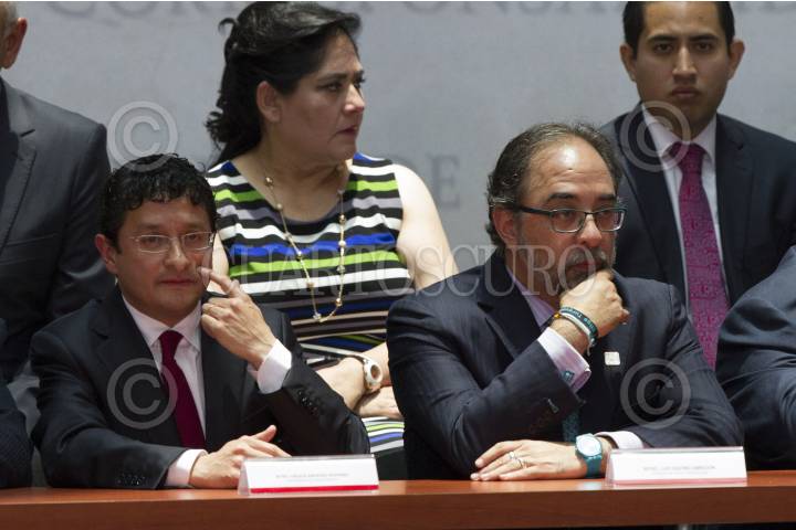 MÉXICO, D.F., 27MAYO2015.- Virgilio Andrade, secretario de la Función Pública y Luis Castro Obregón, dirigente nacional de Nueva Alianza, en la ceremonia de Promulgación de la Reforma por la que se crea el Sistema Nacional Anticorrupción, que se realizó en el Palacio Nacional. FOTO: MOISÉS PABLO /CUARTOSCURO.COM