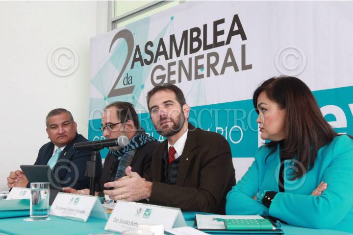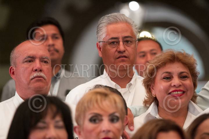 MÉXICO, D.F., 28ENERO2016.- El coordinador parlamentario de Nueva Alianza Luis Alfredo Valles Mendoza; el presidente del Partido Nueva Alianza Luis Castro Obregón, el consejero presidente del INE Lorenzo Córdova Vianello, y la vicecoordinadora de Nueva Alianza Soralla Bañuelos de la Torre, durante la 2da Asamblea General del Grupo Parlamentario Nueva Alianza. FOTO: INE /CUARTOSCURO.COM