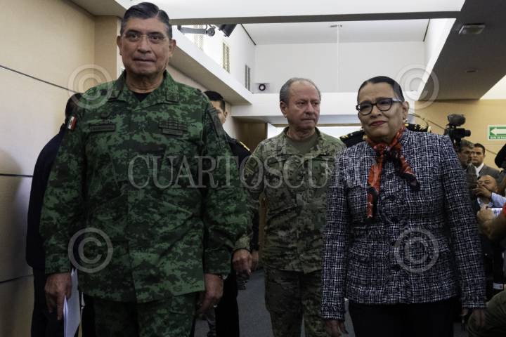 Luis Crescencio Sandoval, Rafael Ojeda Durán, Rosa Icela Rodríguez durante la conferencia de prensa por la detención de Ovidio Guzmán "El Ratón" en Culiacán, Sinaloa.