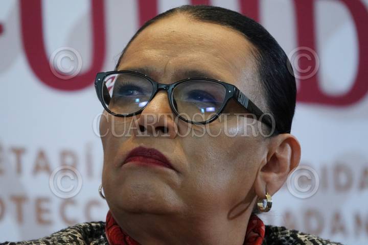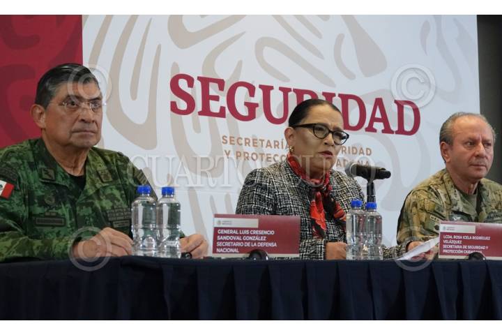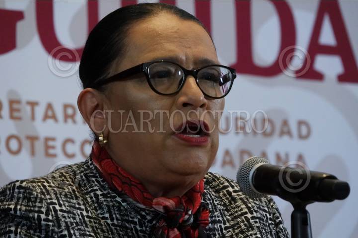 Rosa Icela Rodríguez durante la conferencia de prensa por la detención de Ovidio Guzmán "El Ratón" en Culiacán, Sinaloa.