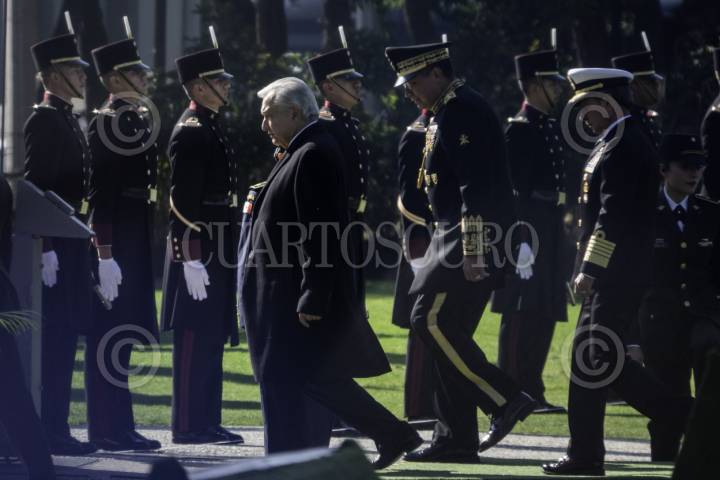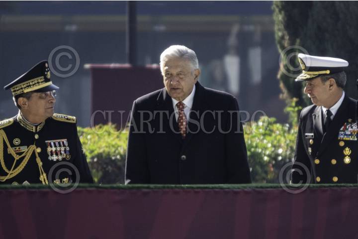 Andrés Manuel López Obrador, Luis Crescencio Sandoval y Rafael Ojeda durante la ceremonia por los 200 años de la creación del Colegio Militar
