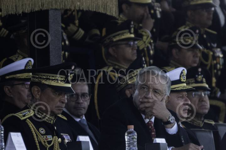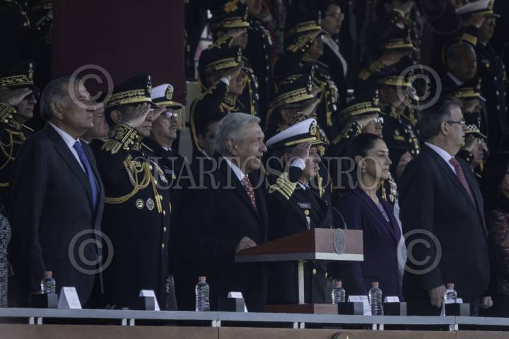 Adán Augusto López, Luis Crescencio Sandoval, Andrés Manuel López Obrador, Rafael Ojeda, Claudia Sheinbaum y Marcelo Ebrard durante la ceremonia por los 200 años de la creación del Colegio Militar