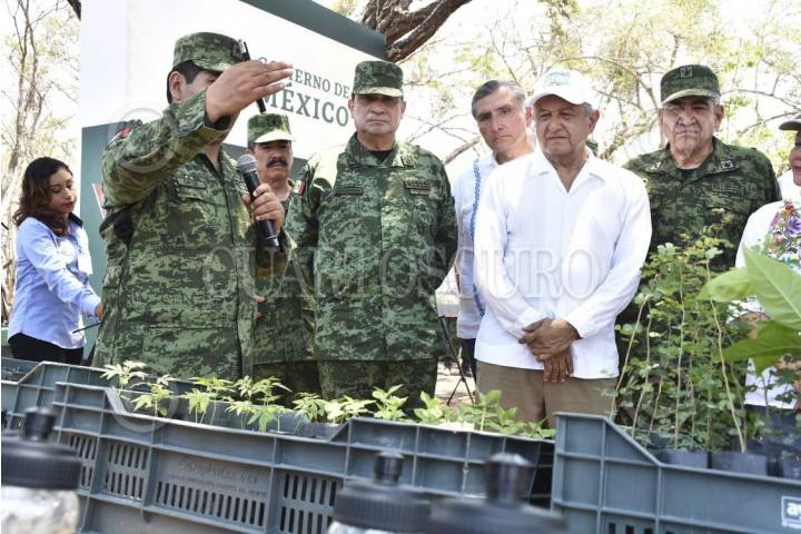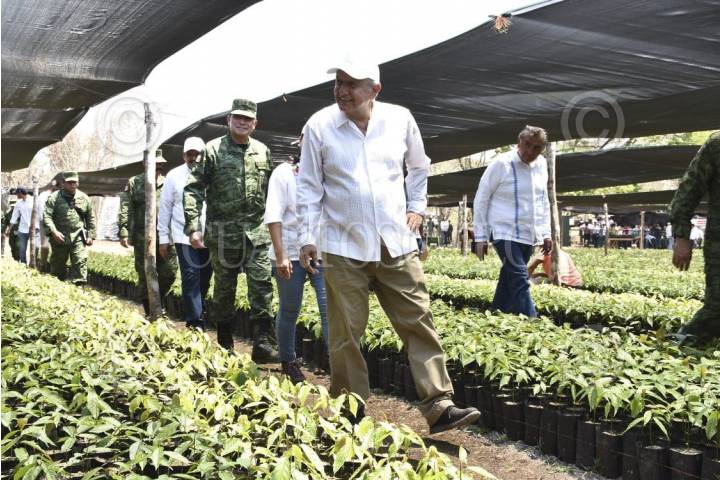 BALANCÁN, TABASCO, 19MAYO2019.- Andrés Manuel López Obrador, Presidente de México visitó el Vivero Forestal, ubicado en Balancán, Tabasco, acompañado del General Luis Cresencio Sandoval González, titular de esta dependencia; María Luisa Albores González, Secretaria de Bienestar y Adán Augusto López Hernández, Gobernador del estado. La Secretaría de la Defensa Nacional participa dentro del programa “Sembrando Vida” del Gobierno de México, con la operación de 12 viveros forestales, con una meta de producción de cien millones de árboles, dentro de los que se encuentra el vivero de “Balancán”. El citado vivero está organizado en 28 módulos para la producción de 14 millones de árboles en dos fases, ocupando un terreno de 20 hectáreas, en el que se producen 10 especies forestales como son: Caoba, Cedro, Tinto, Maculi, Bojon, Popiste, Guano Redondo, Corazón Azul, Zapatero y Tzalam. FOTO: SEDENA /CUARTOSCURO.COM