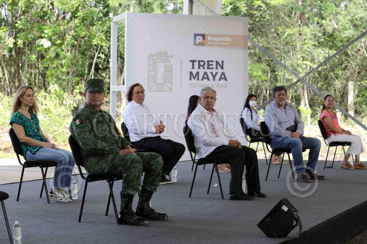 En primera fila Luis Cresencio Sandoval, Andrés Manuel López Obrador, Rogelio Jiménez Pons, y María Luisa Albores González, durante el evento Tren Maya "Tramo 4 Izamal-Cancún".