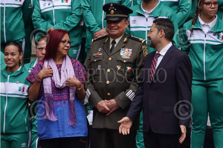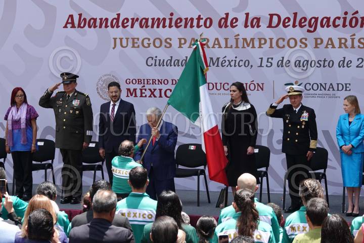 CIUDAD DE MÉXICO, 15AGOSTO2024.- Leticia Ramírez, secretaria de Educación Pública; Luis Cresencio Sandoval, secretario de la Defensa Nacional; Martí Batres, jefe de Gobierno; Andrés Manuel López Obrador, presidente de México; Ana Gabriela Guevara, directora de la CONADE; Rafael Ojeda, secretario de Marina, Blanca Jiménez Cisneros, embajadora de Francia en México, durante el Abanderamiento de la Delegación Mexicana, realizada en el Patio Central de Palacio Nacional. FOTO: GRACIELA LÓPEZ /CUARTOSCURO.COM