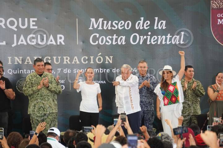 TULUM, QUINTANA ROO, 07AGOSTO2024.- Luis Cresencio Sandoval, secretario de la Defensa Nacional; Claudia Sheinbaum, presidenta electa de México; Andrés Manuel López Obrador, presidente de México; Mara Lezama, gobernadora de Quintana Roo, y María Luisa Albores González, secretaria de Medio Ambiente y Recursos Naturales, encabezaron la inauguración del "Parque del jaguar: Museo de la Costa Oriental". FOTO: ELIZABETH RUIZ/CUARTOSCURO.COM