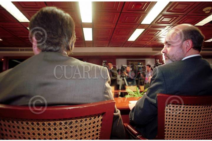 El Coordinador de Politicas Públicas de la Presidencia Eduardo Sojo, y el director del Banco Mexicano de Comercio Exterior (BANCOMEXT), durante la conferencia conjunta que ofrecieron esta tarde en la sede de la institucion de crédito. FOTO: Pedro Mera/CUARTOSCURO.COM