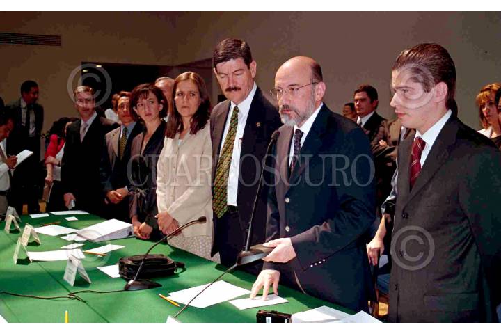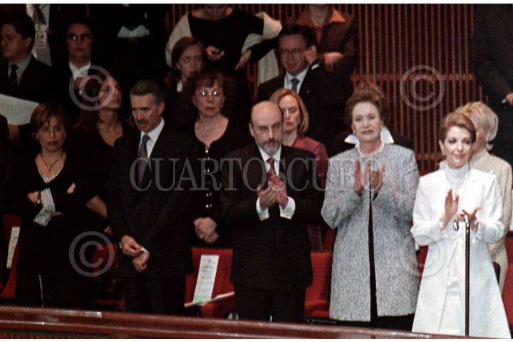 El contraste entre la indiferencia y la ovación lo muestra claramente esta imagen. Aunque en la misma fila, una es la actitud de los presidentes del PRD, Rosario Robles, y del PRI, Roberto Madrazo; y, otra, la del presidente del PAN, Luis Felipe Bravo Mena, y de la primera dama, Martha Sahagún. FOTO: Oswaldo Ramírez/CUARTOSCURO.COM
