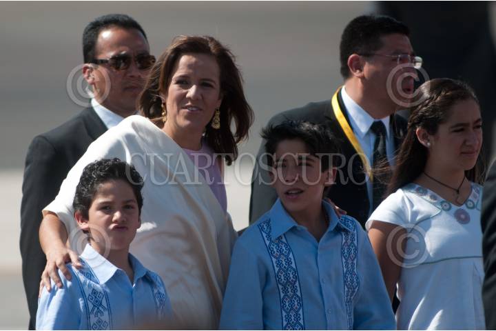 SILAO, GUANAJUATO, 23MARZO2012.- Margarita Zavala, primera dama de México, llegó acompañada con sus hijos Juan Pablo, Luis Felipe y María, a el Aeropuerto Internacional de Guanajuato en donde llegó el Papa Benedicto XVI para realizar una gira por la zona del bajío. FOTO: MOISÉS PABLO /CUARTOSCURO.COM
