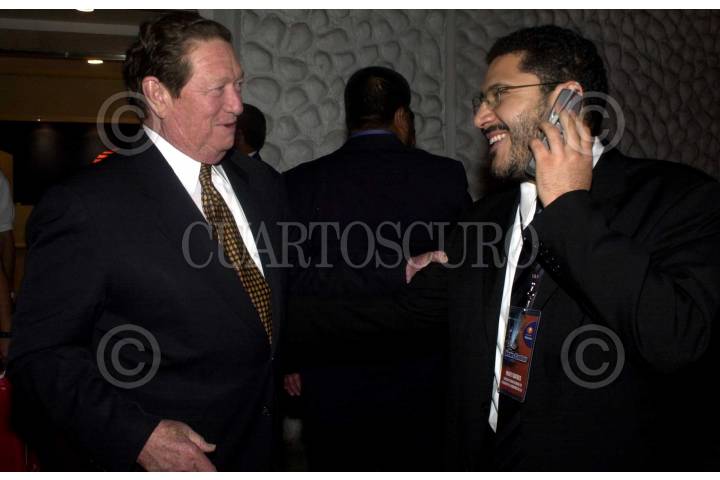 Diego Fernandez de Cevallos y Luis Felipe Bravo Mena conversan durante el cierre de campaña del PAN. FOTO: Nelly Salas/CUARTOSCURO.COM