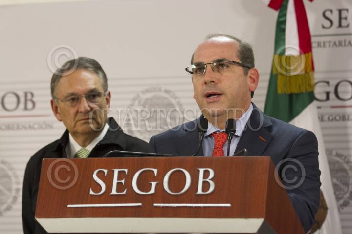CIUDAD DE MÉXICO, 24AGOSTO2016.- Luis Felipe Puente Espinosa, coordinador General de Protección Civil de la Secretaria de Gobernación, y Roberto Ramírez de la Parra, director de la Comisión Nacional del Agua (CONAGUA), ofrecieron una conferencia de prensa para hablar sobre el pronostico de las lluvias en todo el país, así como la actualización de cuantos fenómenos meteorológicos se formarán en los próximos meses. FOTO: MOISÉS PABLO /CUARTOSCURO.COM