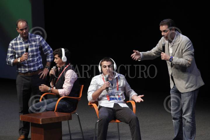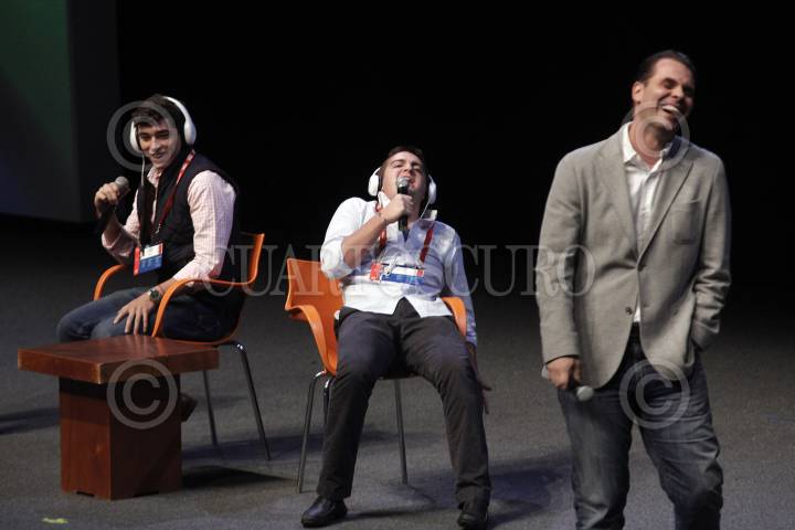 PUEBLA, PUEBLA, 08NOVIEMBRE2014.- Los comentaristas deportivos Luis García y Christian Martinolli, durante su presentación en el festival La Ciudad de las Ideas: Change the World, que se lleva a cabo en el Complejo Cultural Universitario de la BUAP. FOTO: HILDA RÍOS /CUARTOSCURO.COM