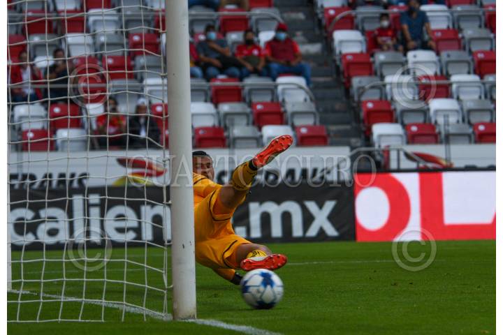Luis García portero de los Diablos del Toluca durante la primera anotación de Rayados de Monterrey en el partido pendiente de la jornada 4 del Torneo Grita México C22.