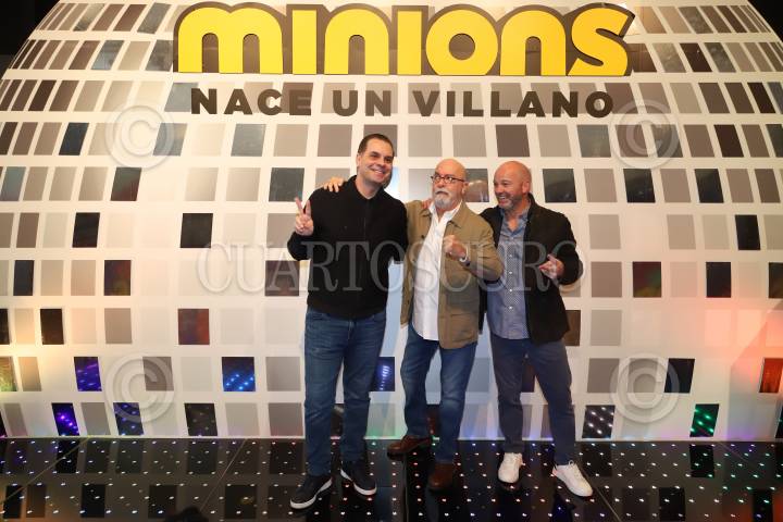 Christian Martinoli, Andrés Bustamante y Luis García quienes prestan sus voces durante la alfombra roja por el estreno de la película animada “Minions, Nace un villano” en un cine de Polanco.