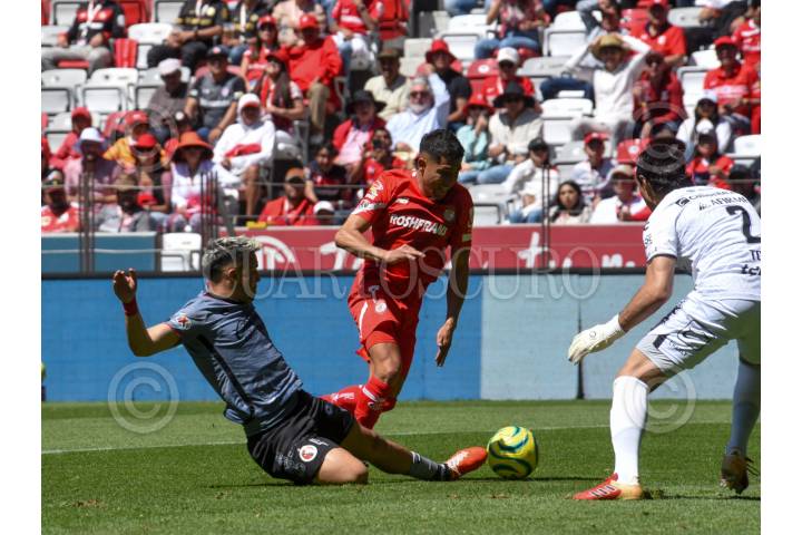 TOLUCA, ESTADO DE MÉXICO, 25FEBRERO2024.- Juan Pablo Domínguez medio de los Diablos de Toluca y Nicolás Díaz defensa y Luis García portero de los Xolos de Tijuana, en el partido correspondiente a la jornada 8 del Torneo Clausura 2024, obteniendo el triunfo la escuadra choricera con un marcador final 2-0. FOTO: CRISANTA ESPINOSA AGUILAR /CUARTOSCURO.COM