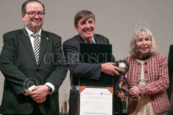 CIUDAD DE MÉXICO, 20AGOSTO2024.- Luis García Montero recibió el Premio Internacional Carlos Fuentes, en la Sala Adamo Boari en el Palacio de Bellas Artes. En la imagen lo acompañan Leonardo Lomelí, rector de la UNAM, y Silvia Lemus, viuda de Carlos Fuentes. FOTO: MOISÉS PABLO/CUARTOSCURO.COM
