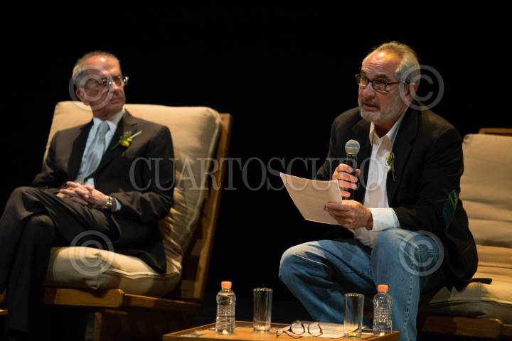 CIUDAD DE MÉXICO, 09NOVIEMBRE2017.- Andrés Torres, responsable de Extensión Cultural del INBA y Oscar Narváez, actor mexicano, durante el homenaje póstumo a "Luis Gimeno y su generación teatral, una trayectoria de resistencia, dedicación y entusiasmo", realizado en el Teatro Salvador Novo del Centro Nacional de las Artes (CENART). FOTO: ADOLFO VLADIMIR /CUARTOSCURO.COM