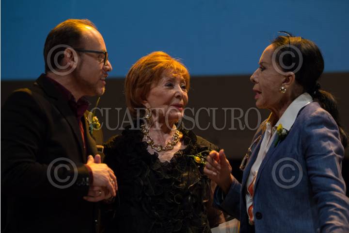 CIUDAD DE MÉXICO, 09NOVIEMBRE2017.- Arturo Díaz, responsable del Centro Nacional de Investigación, Documentación e Información Teatral del INBA, Virginia Gutiérrez, actriz y viuda de Luis Gimeno y Lilia Aragón, actriz mexicana, durante el homenaje póstumo a "Luis Gimeno y su generación teatral, una trayectoria de resistencia, dedicación y entusiasmo", realizado en el Teatro Salvador Novo del Centro Nacional de las Artes (CENART). FOTO: ADOLFO VLADIMIR /CUARTOSCURO.COM