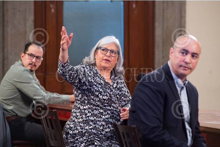Luis Godoy Rueda, Graciela Márquez Colín, y Leonardo álvarez Córdova, durante la conferencia de prensa de entrega de créditos para apoyar y reactivar la economía por la crisis derivada por la pandemia de Covid-19.