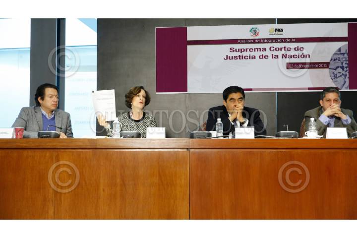 MÉXICO, D.F., 23NOVIEMBRE2015.- El senador Mario Delgado; la periodista Denise Dresser; el coordinador parlamentario Miguel Barbosa y Luis Humberto Fernández Fuentes, al finalizar el foro "Análisis de Integración de la Suprema Corte de Justicia de la Nación", que se realizó en el Senado. FOTO: CUARTOSCURO.COM