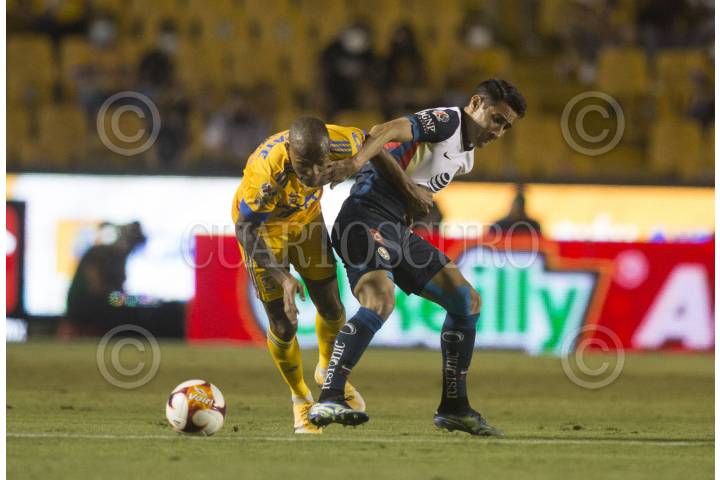 Luis Quiñones del equipo de los Tigres de la UANL, disputa el balón con Luis Fuentes del equipo del América, en el estadio Universitario, partido correspondiente a la jornada 14 de la Liga Mx, Clausura Guardianes 2021. Marcador Final: Tigres: 1 - América: 3