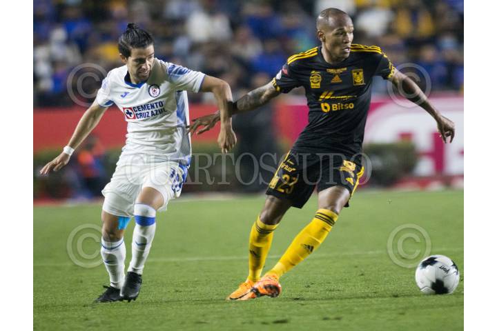 Luis Quiñones del equipo de los Tigres de la UANL, se disputa el balón con José Rivero del Cruz Azul, en el estadio Universitario, partido correspondiente a la jornada 8 de la Liga Mx, Clausura 2022. Marcador Final: Tigres: 2 - Cruz Azul: 2