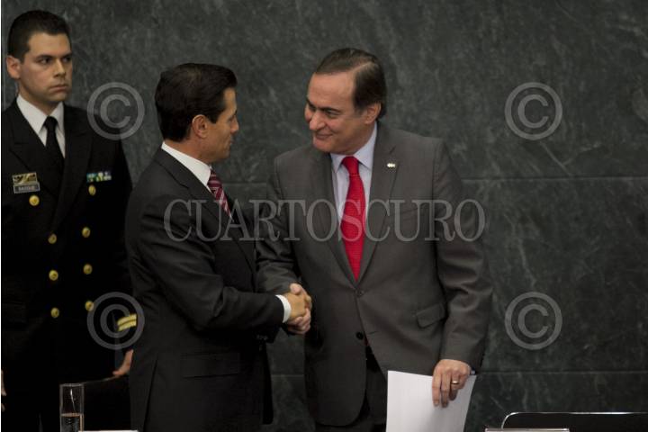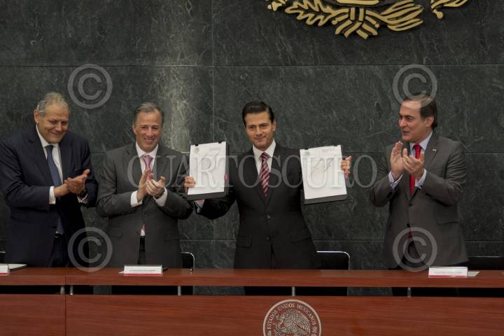 CIUDAD DE MÉXICO, 17ENERO2017.- Luis Robles Miaja, presidente de la Asociación de Bancos de México; José Antonio Meade Kuribeña, secretario de Hacienda y Crédito Público; El presidente Enrique Peña Nieto, y Juan Pablo Castañón, presidente del Consejo Coordinador Empresarial, durante la firma de los decretos para la deducción inmediata y la repartición de capitales, con el fin de impulsar la inversión productiva y la generación de empleo. FOTO: GALO CAÑAS /CUARTOSCURO.COM