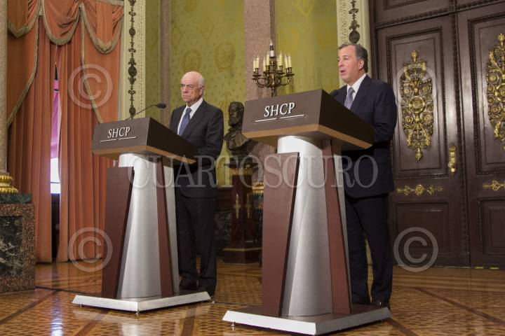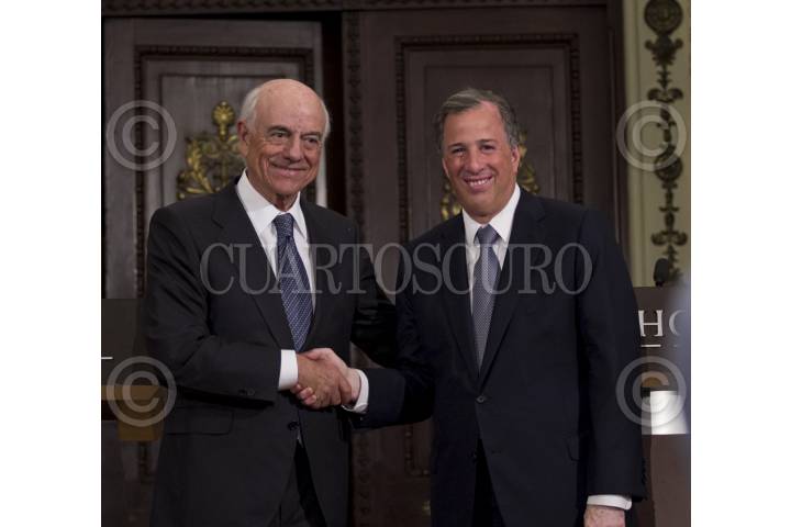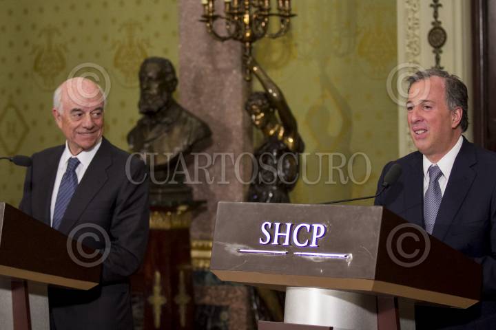 CIUDAD DE MÉXICO, 02MARZO2017.- Francisco González Rodríguez, presidente de grupo BBVA Bancomer, y José Antonio Meade Kuribreña, secretario de Hacienda y Crédito Público, ofrecieron un mensaje a medios para destacar la importancia de la cooperación entre ambas organizaciones. González Rodríguez expresó que no se encuentra preocupado por las políticas proteccionistas del presidente estadounidense, Donald Trump. FOTO: GALO CAÑAS /CUARTOSCURO. COM