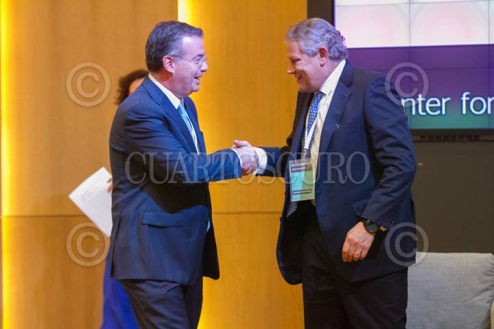 CIUDAD DE MÉXICO, 15JUNIO2017.- Alejandro Díaz de León Carrillo, subgobernador del Banco de México, y Luis Robles Miaja, presidente del Consejo de Administración del Grupo Financiero BBVA Bancomer, durante la inauguración del foro "EduFin Summit 2017", que se realizó en la Torre Bancomer. FOTO: MOISÉS PABLO /CUARTOSCURO.COM