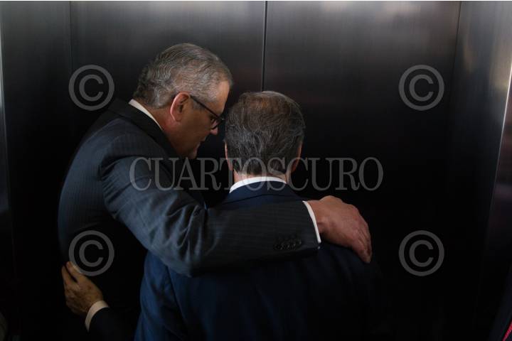 CIUDAD DE MÉXICO, 13MARZO2018.- Luis Robles Miaja, presidente del Consejo de Administración del Grupo Financiero BBVA Bancomer, abraza a José Antonio Meade, candidato del PRI a la Presidencia de la República, tras concluir una reunión con ejecutivos de Bancomer. FOTO: MOISÉS PABLO /CUARTOSCURO.COM