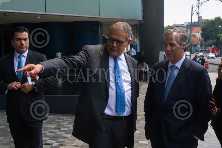 CIUDAD DE MÉXICO, 13MARZO2018.- Luis Robles Miaja, presidente del Consejo de Administración del Grupo Financiero BBVA Bancomer; José Antonio Meade, candidato del PRI a la Presidencia de la República, y Eduardo Osuna Osuna, director general de BBVA Bancomer, tras la reunión que sostuvo el candidato con ejecutivos de Bancomer. FOTO: MOISÉS PABLO /CUARTOSCURO.COM