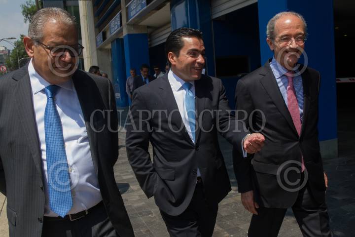 CIUDAD DE MÉXICO, 13MARZO2018.- Luis Robles Miaja, presidente del Consejo de Administración del Grupo Financiero BBVA Bancomer; Eduardo Osuna Osuna, director general de BBVA Bancomer, y José Manuel González-Páramo, consejero ejecutivo de BBVA, tras la reunión que sostuvieron con el candidato presidencial José Antonio Meade, que se realizó en la Torre Bancomer. FOTO: MOISÉS PABLO /CUARTOSCURO.COM
