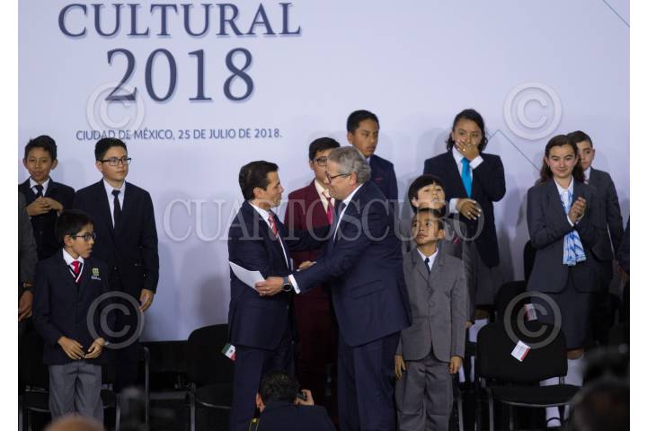 CIUDAD DE MÉXICO, 25JUNIO2018.- Enrique Peña Nieto, presidente de la República, y Luis Robles Miaja, presidente del Consejo de Administración del BBVA Bancomer, durante la entrega de reconocimientos a alumnos de excelencia y ganadores en la Olimpiada del Conocimiento 2018. En las inmediaciones de la explanada Francisco I. Madero de la Residencia Oficial de los Pinos. FOTO: GALO CAÑAS /CUARTOSCURO.COM
