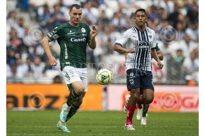 Luis Romo de los Rayados del Monterrey, se disputa el balón con Leonardo Bonatini del Atlético San Luis, en el estadio BBVA, partido correspondiente a la jornada 3 de la Liga MX, Clausura 2023.