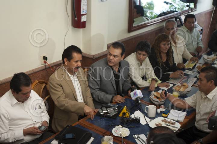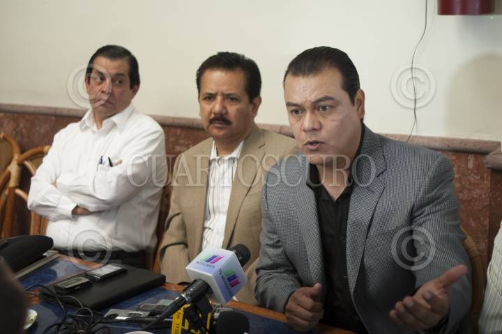 CIUDAD NEZAHUALCOYOTL, ESTADO DE MEXICO, 07SEPTIEMBRE2012.- El dirigente estatal del Partido de la Revolución Democrática, Juan Hugo de la Rosa, el senador por el estado de México y Luis Sánchez Jiménez ofrecieron una conferencia de prensa donde se deslindaron de Movimiento Ciudadano, organización a la que pertenece Francisco Fernández "El Tun Tun" el cual liderea a la organizaciones de moto-taxis del Municipio de Chicoloapan y que se enfrentó el pasado miércoles aintegrantes de Antorcha Campesina dejando como saldo un muerto, derivado de todo esto ayer circuló en todo el municipio y colindantes rumores de turbas asaltando, disparando y quemando negocios lo que generó una psicosis que obligó a la gente acerrar negocios y escuelas. FOTO: FRANCISCO RODRÍGUEZ / CUARTOSCURO.COM