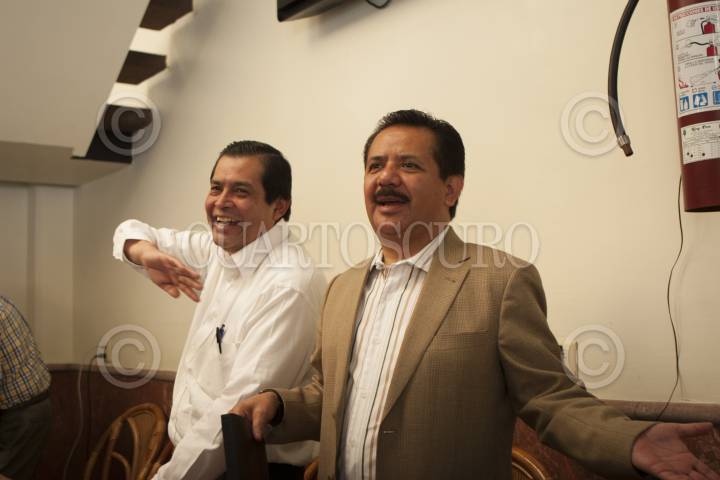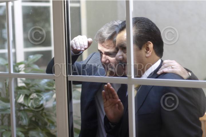 MÉXICO, D.F., 28ENERO2014.- Los senadores Fernando Mayans Canabal y Luis Sánchez Jiménez observan curiosos a través de una ventana la conferencia del Jefe de Gobierno Miguel Ángel Mancera, quien asistió como invitados a la 4a Reunión Plenaria del Grupo Parlamentario del PRD en la Cámara Alta. FOTO: MOISÉS PABLO /CUARTOSCURO.COM