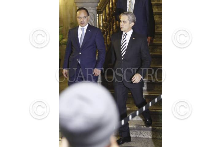 MÉXICO, D.F., 30ENERO2013.- Miguel Ángel Mancera, Jefe de Gobierno, conversa con Manuel Granados, presidente de la comisión de gobierno de la ALDF, durante el evento en el cual el mandatario capitalino firmó un convenio con la Comisión Unidos vs la Trata para la creación de un call center que atienda las denuncias de las personas que sean víctimas de la trata de personas. FOTO: MOISÉS PABLO /CUARTOSCURO.COM