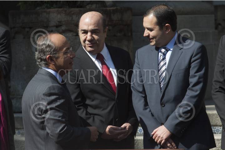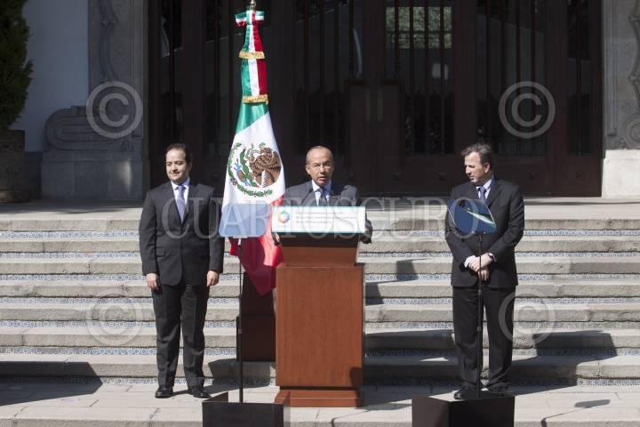 MÉXICO, D.F., 09NOVIEMBRE2012.- Alejandro Poire, secretario de Gobernación, Felipe Calderón Hinojosa, Presidente de México, y José Antonio Meade Kuribreña, secretario de Hacienda y Crédito Público, durante la ceremonia en donde se firmo el decreto que reforma la Ley General de Contabilidad Gubernamental, iniciativa que mando el Jefe del Ejecutivo en calidad de preferente a la Cámara de Diputados. FOTO: MOISÉS PABLO /CUARTOSCURO.COM